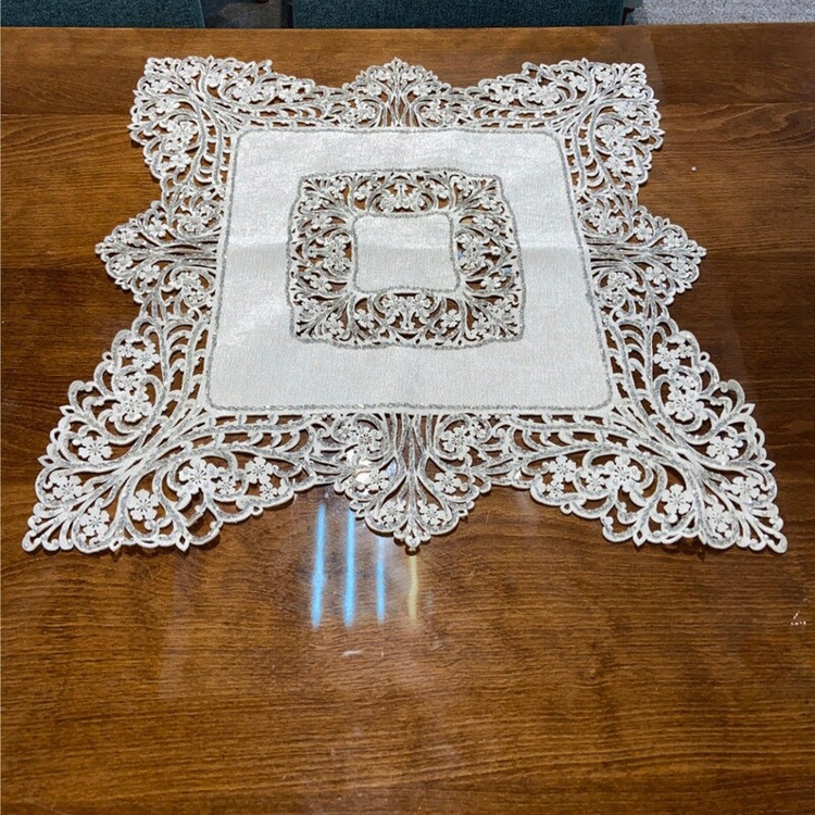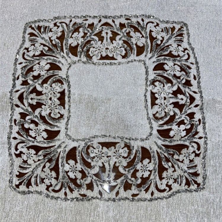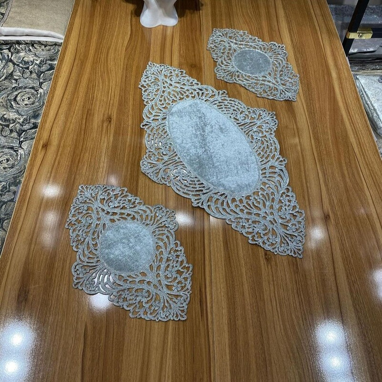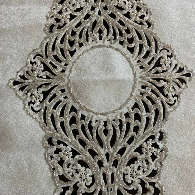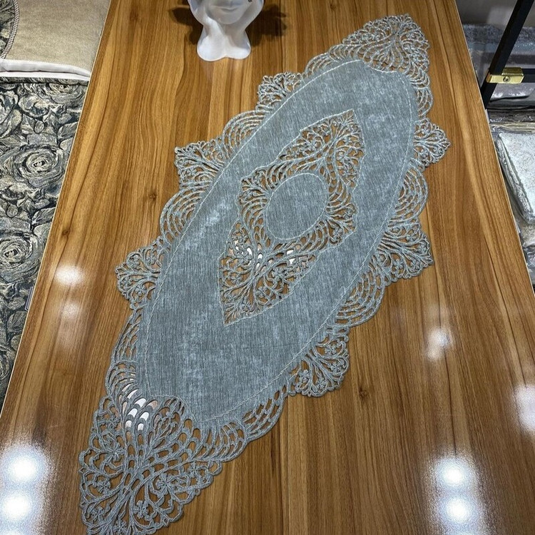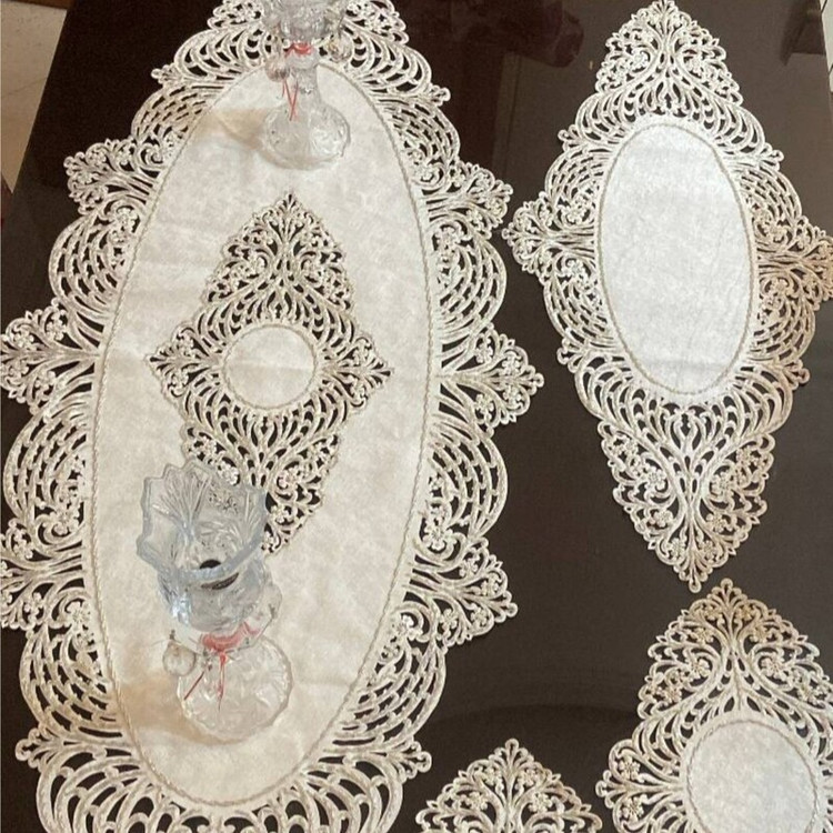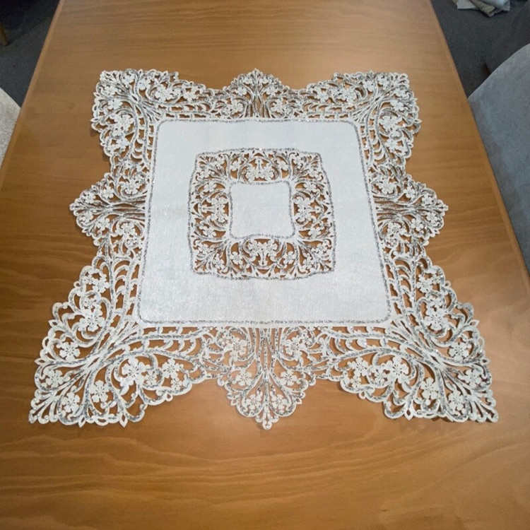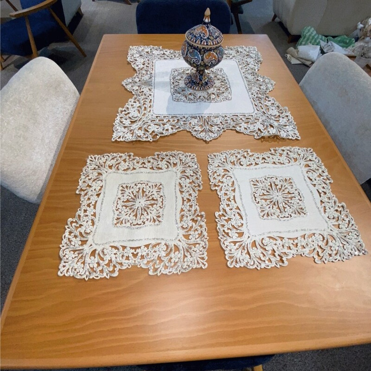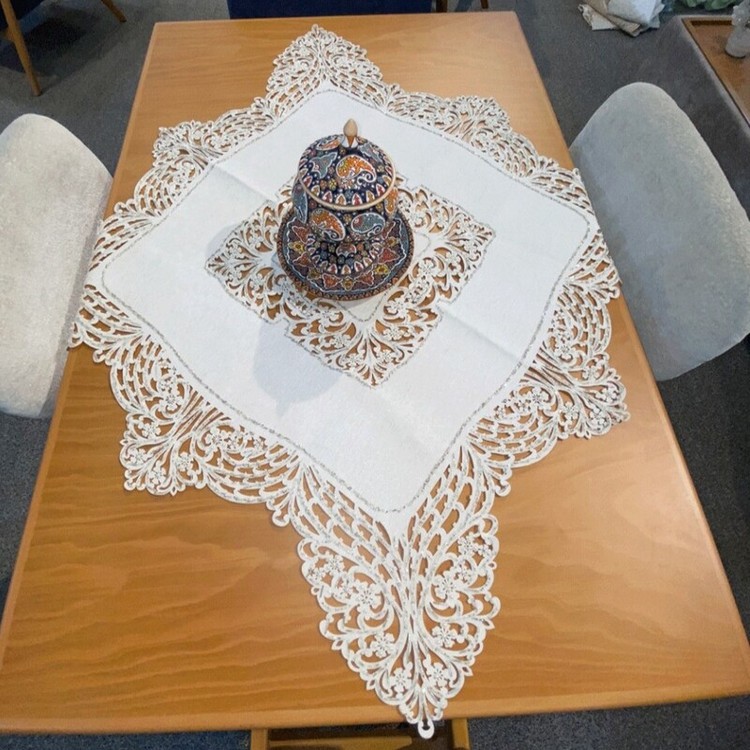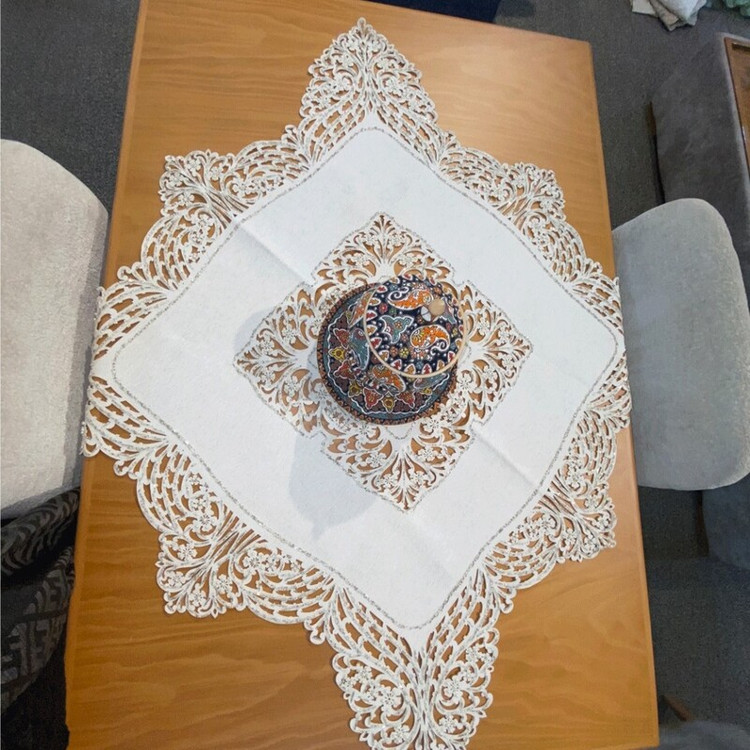 رومیزی گل دوزی شده در 3 رنگ سفید (شیری) و کرم و طوسی هستش در ابعاد مختلف برای انواع میز ها کار دست هستش با دقت تمام ظریف کاری شده